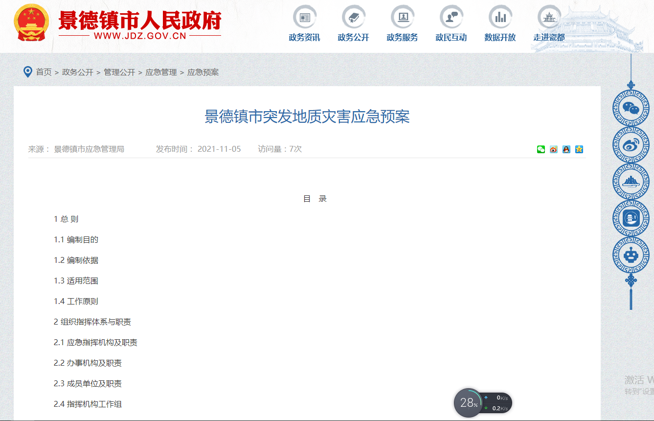 景德镇市人民政府办公室于2021年9月7日印发《景德镇市突发地质灾害应急预案》。为了高效有序地做好突发地质灾害应急工作,避免或最大程度地减轻地质灾害造成的损失,保护人民群众生命和财产安全,维护全市社会安全与稳定,制定了该预案。
