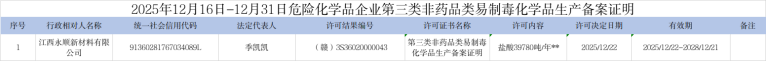 2025年12月16日-12月31日危险化学品企业第三类非药品类易制毒化学品生产备案证明办理结果清单