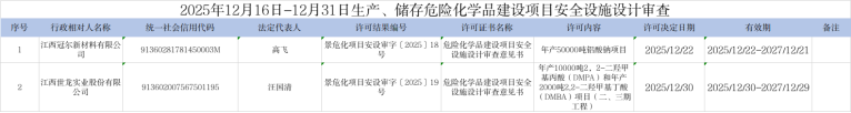 2025年12月16日-12月31日生产、储存危险化学品建设项目安全设施设计审查办理结果清单