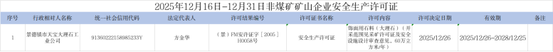 2025年12月16日-12月31日非煤矿矿山企业安全生产许可证办理结果清单