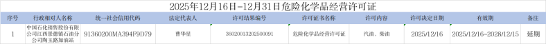 2025年12月16日-12月31日危险化学品经营许可证办理结果清单