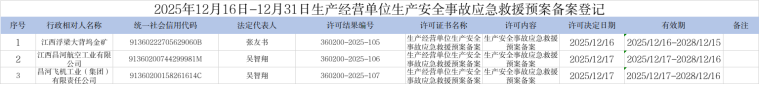 2025年12月16日-12月31日生产经营单位生产安全事故应急预案备案登记办理结果清单