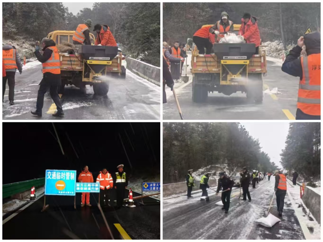 一是针对冬季路面易结冰的特点,各分中心在前期排查出的桥梁、急弯、陡坡等易结冰路段提前设置安全警示牌、警示柱及反光标志,提醒往来司机减速慢行。通过密切追踪气象变化动态,采用“路网平台监控+人工路上巡查”联动模式,加密辖区普通国省道全路段巡查频次,确保隐患早发现、早处置,为快速应对低温雨雪灾情筑牢前置防线;二是为确保除雪保畅“弹药充足、响应迅速”,市中心提前储备足量工业盐、编织草袋、防滑链等应急物资,同时对融雪剂撒布机、铲车等除雪设备开展全面保养调试,确保性能稳定、运转正常。雪情发生后,各级应急队伍须迅速集结、火速奔赴一线,按照“先重点、后一般,先干线、后支线”的处置原则,机械化撒布融雪剂与人工清雪除冰同步推进,以最快速度消融冰雪、畅通道路。19日至21日,中心部分管养路段出现积雪、冰冻灾害,严重影响行车安全。如1月20日浮梁县S205瑶鹅线K0+000到K3+000虎头岗至汪湖村、S302紫曲线K100+000到K102+000梅岭段出现道路结冰灾情。公路职工闻雪而动、“欲”雪奋战保畅通。立即联合公安交管、当地政府对出现冰雪灾害路段采取交通管制、封闭交通,并立即进行撒盐除冰作业,于当日17时处置完毕并恢复交通。自1月19日至今出动应急人员476人次,出动89台班巡逻车辆、平地机、除雪车、撒布机等机械设备,设置警示标志牌177块,撒布融雪剂、工业盐12吨,全力保障我市普通国省干线交通通行安全;三是中心领导率先垂范、带队出征,深入全路段开展安全巡查,现场排查风险隐患,对路面结冰、交通拥堵等问题第一时间调度处置。全体党员干部充分发挥先锋模范作用,以党建为引领,顶风冒雪、不畏严寒,在凛冽风雪中用脚步丈量责任,用行动守护畅通,生动诠释着公路人的坚守与担当。