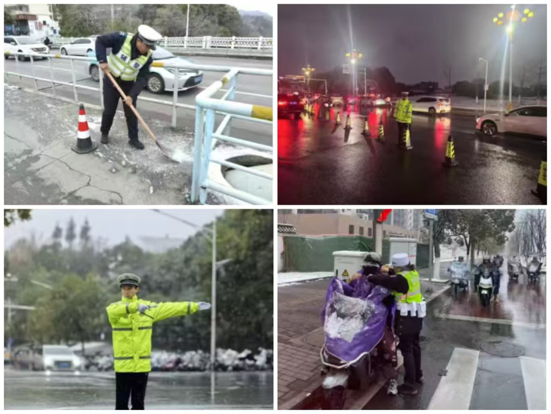 面对恶劣天气,市公安局交管支队迅速启动道路交通安全管理工作应急处置预案,全警动员、全员上路,用坚守与担当筑起一道坚不可摧的交通安全屏障。一是珠山大队全力投入交通疏导工作,执勤民辅警分赴各重点路段、路口,加强指挥疏导和巡逻管控,及时处理轻微事故,快速排除拥堵节点。在珠山中路、浙江路、广场南路,民警引导车辆减速缓行,提醒驾驶员保持安全车距;二是昌江大队在常态化巡逻中,第一时间发现瓷都大桥桥面出现少量薄冰,民辅警迅速携带融雪盐、铁锹等工具赶赴现场,分工协作开展除冰作业,在关键点位引导车辆减速慢行、谨慎通过,成功保障了桥梁通行安全畅通;三是昌南大队采取“定点值守+动态巡逻”模式,在车流密集的路口引导车辆减速慢行、有序通行。在辖区内景西、景北高速路口因降雪关闭时,部署警力指引过往车辆驶离、引导大货车有序排队并耐心做好解释工作。为提升应急处置效能,大队事故处理民辅警实现轻微事故快速处置、快速撤离,最大限度减少道路拥堵;四是南河大队紧盯主干道、桥梁、坡道等易结冰路段,强化定点值守与动态巡逻,加密路面管控频次。执勤民辅警顶风冒雪指挥交通,引导车辆有序通行。通过警车喊话、现场劝导等方式,反复叮嘱驾驶人减速慢行、保持车距,切勿急刹变道,同时快速处置轻微事故、清理路面隐患,全力防范道路拥堵和交通事故;五是停管大队组织警力奔赴各重点路口,有条不紊开展应急疏导工作。同时积极劝导摩托车、电动车驾驶人佩戴好安全头盔;面对拥堵车流,立刻协调调整信号灯配时,适当延长绿灯通行时间,确保路口通行秩序井然。